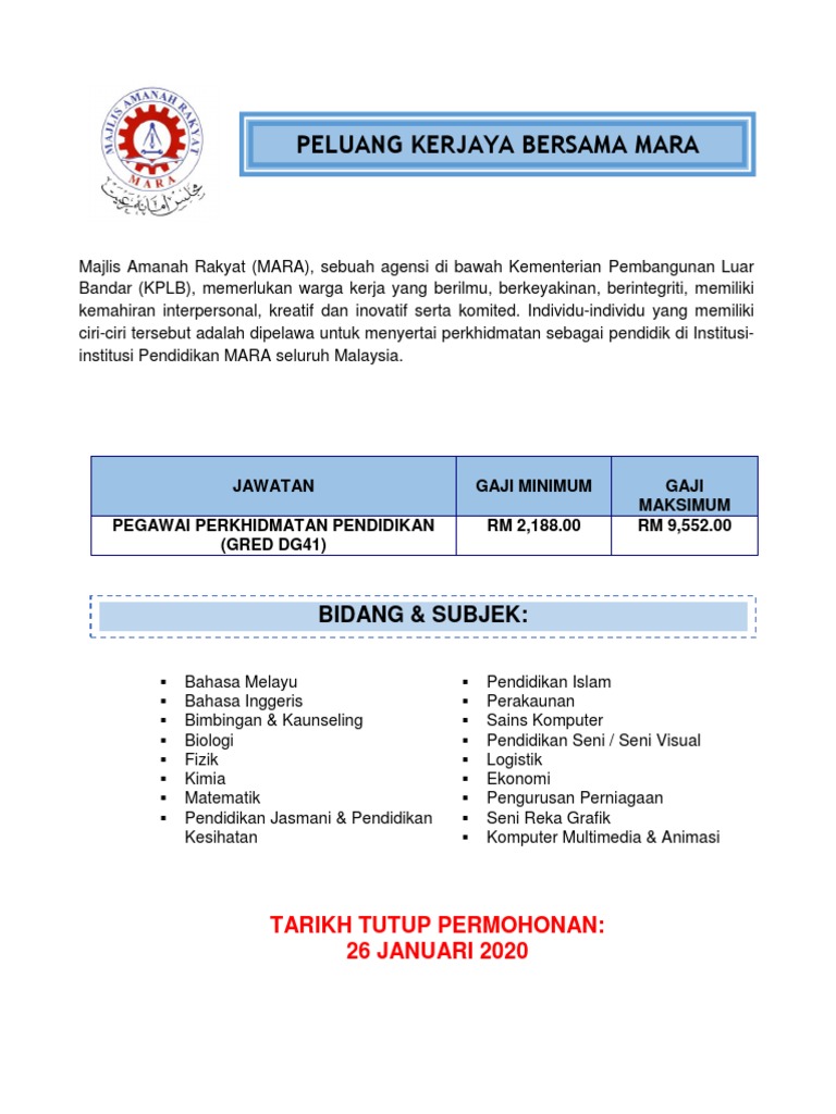 Peluang Kerjaya Bersama Mara Pegawai Perkhidmatan Pendidikan Gred Dg41 Mingguan Kerja