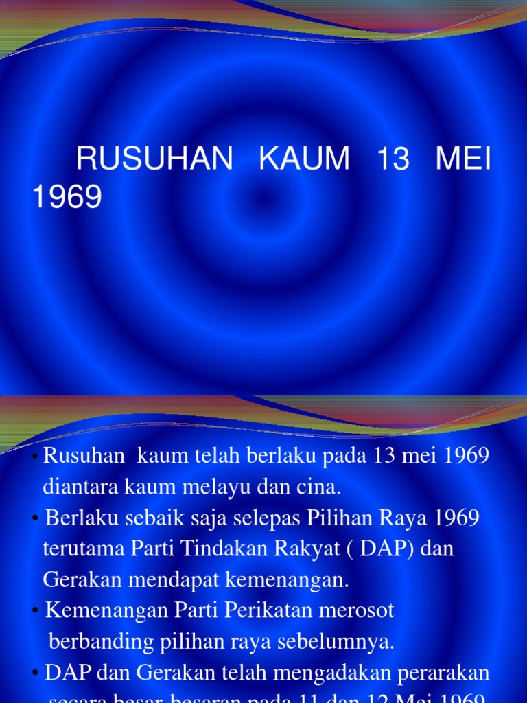 Rusuhan kaum 13 mei 1969 pengajian malaysia. Kuala lumpur peristiwa berdarah rusuhan kaum paling dahsyat di negara ini pada 13 mei 1969 perlu menjadi pengajaran betapa pentingnya masyarakat berbilang kaum di negara ini untuk terus bersatu padu dan hidup dalam harmoni. Berikutan rusuhan yang belaku pada 13 mei di sekitar kuala lumpur dan selangor pada 16 mei 1969 darurat telah diisytharkan oleh yang di pertuan agong di bawah ordinan no 2 kuasa kuasa perlu darurat 1969 p u a 149. Dengan pengisytiharan itu perlembagaan persekutuan digantung. Peristiwa 13 mei pada tahun 1969 adalah rusuhan kaum yang berlaku sebagai kemuncak masalah perpaduan di malaysia.
