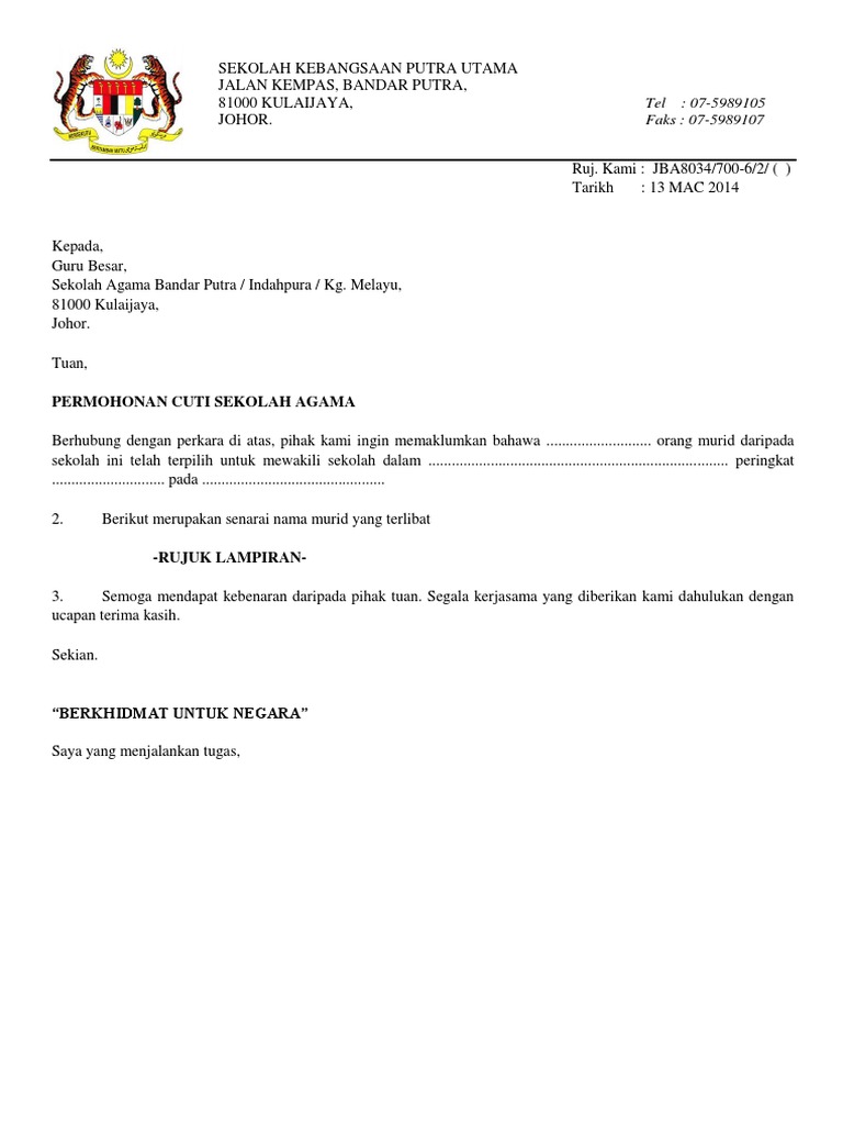 Surat Cuti Sekolah Agama